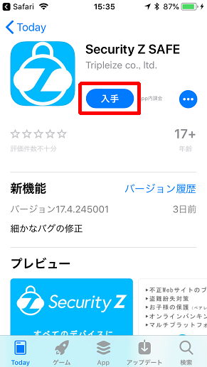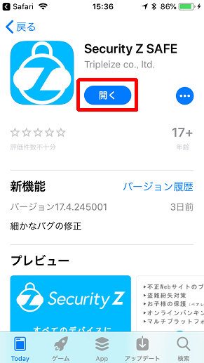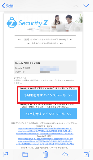 ①safeavenue@f-secure.com より「【重要】オンラインセキュリティサービス Security Z 会員IDとパスワードのお知らせ」というメールが届きます。 メール本文にある[SAFEを今すぐインストール]をタップしてください。