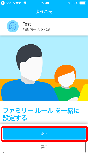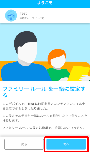 ⑫「ファミリールールを一緒に設定する」の画面が表示されますので、[次へ]をタップしてください。
