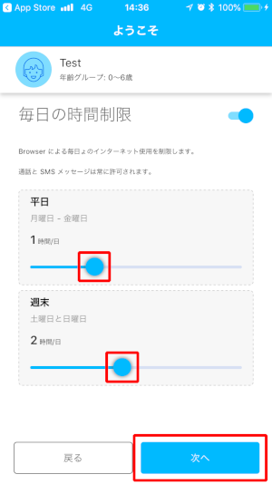 ⑬「毎日の時間制限」の設定画面が表示されますので、時間を設定し[次へ]をタップしてください。