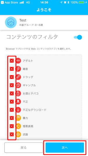 ⑮「コンテンツのフィルタ」の画面が表示されますので、ブロックしたいwebサイトを設定し、[次へ]をタップしてください。