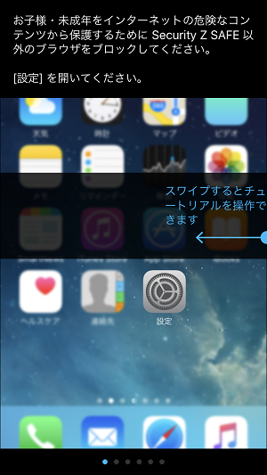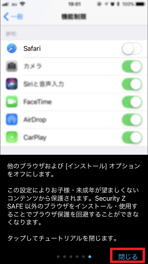 ⑰Safariを非表示にするためのチュートリアルが表示されるので、内容をご確認ください。最後のページで[閉じる]をタップしてチュートリアルを閉じます。