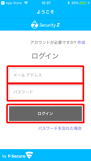 ⑤Security Z SAFEのログイン画面が表示された場合は、「【重要】オンラインセキュリティサービス Security Z 会員ID(メールアドレス)とパスワードのお知らせ」メールに記載されているSecurity Z会員IDとパスワードを入力し、[ログイン]をタップしてください。