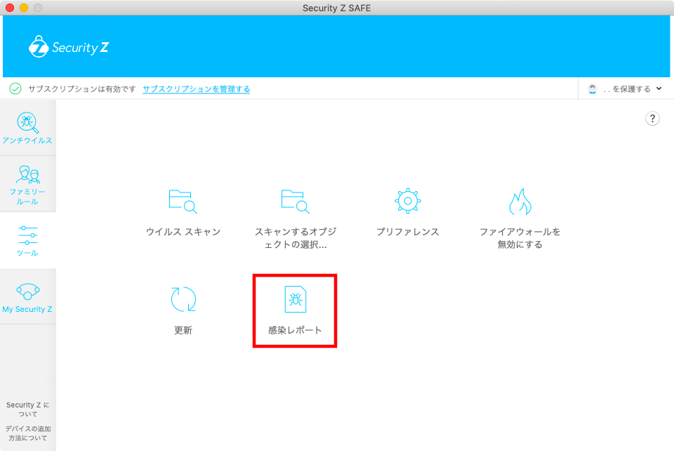 ②「ツール」を選択したら、「感染レポート」をクリックしてください。