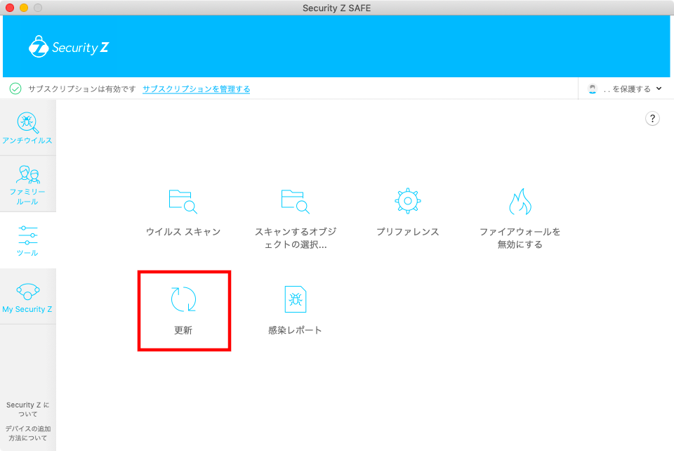 Security Z SAFE のステータス画面を表示し、「ツール」をクリックしてください。