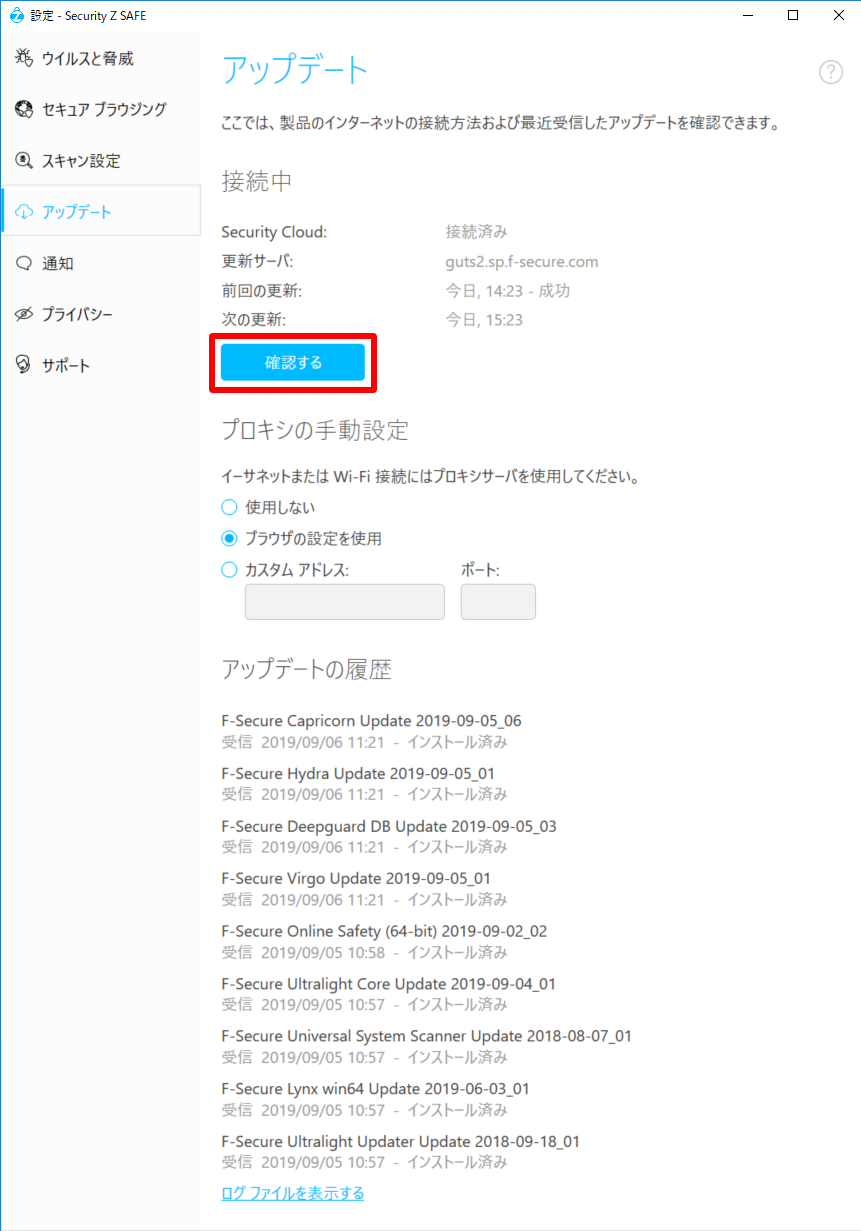 ①Security Z SAFE のツールをクリックし、「更新」をクリックしてください。※通常、更新を手動で確認する必要はありません。自動更新 が有効の場合、本製品はコンピュータがインターネットに接続しているときに最新の更新をダウンロードします。