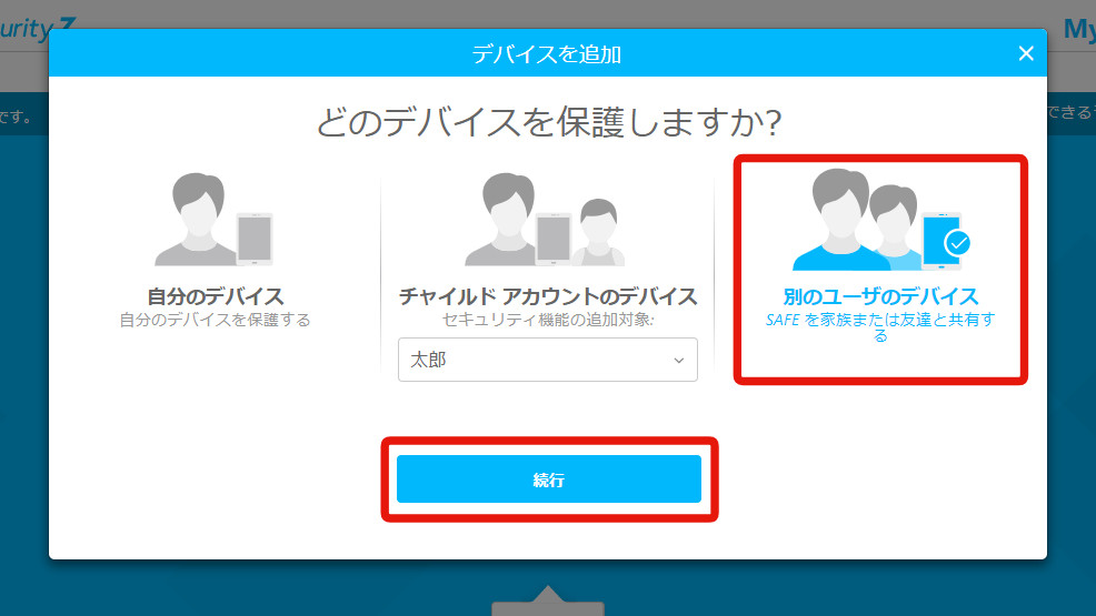 ③画面右側に表示されている「別のユーザのデバイス」を選択し、「続行」をクリックしてください。
