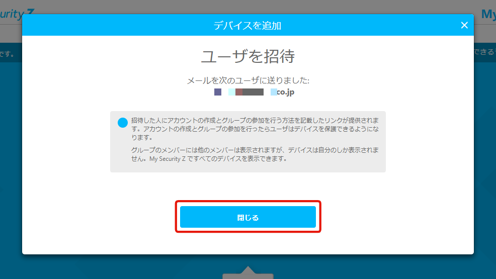⑤入力したメールアドレス宛に招待メールが送信されますので、「閉じる」をクリックしてください。